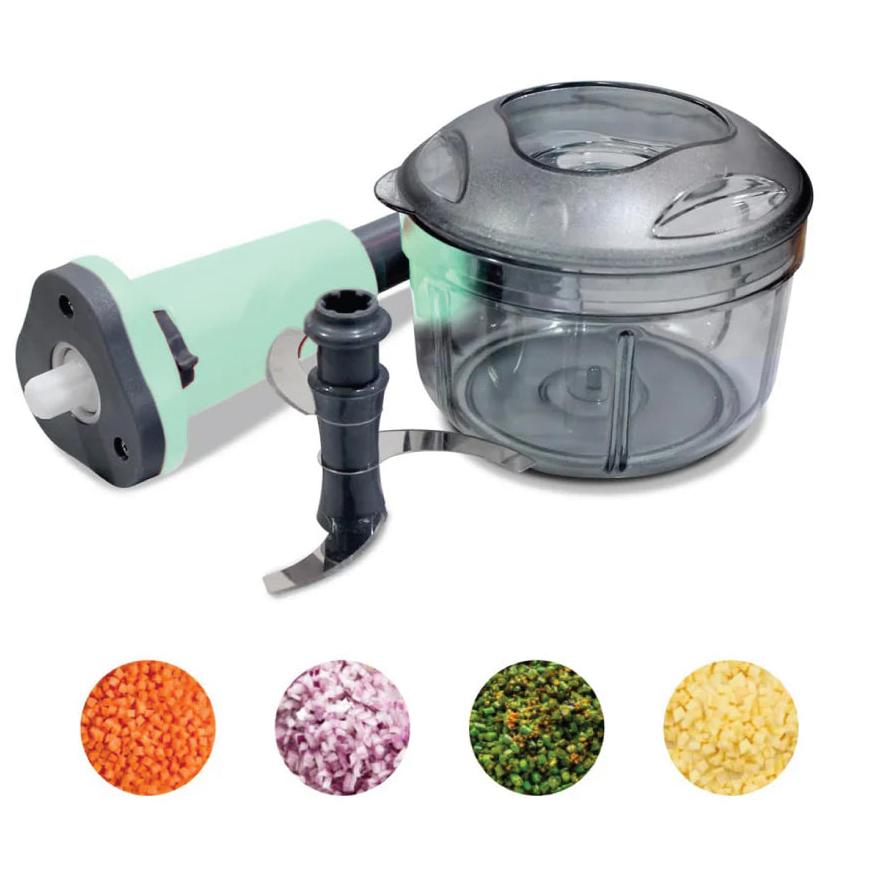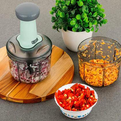 A compact hand-press chopper with a clear container, ideal for quick chopping of onions, carrots, chilies, and more. Features sharp multi-blades, a smooth press handle, and a durable build for everyday kitchen use.